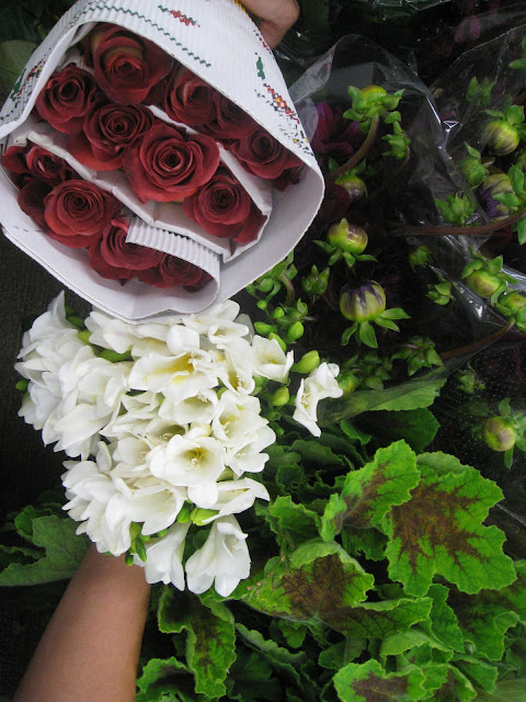 Took a short jaunt to the flower district yesterday for the Wilson Foundation luncheon. Here's our color palette. I think they will be quite nice.